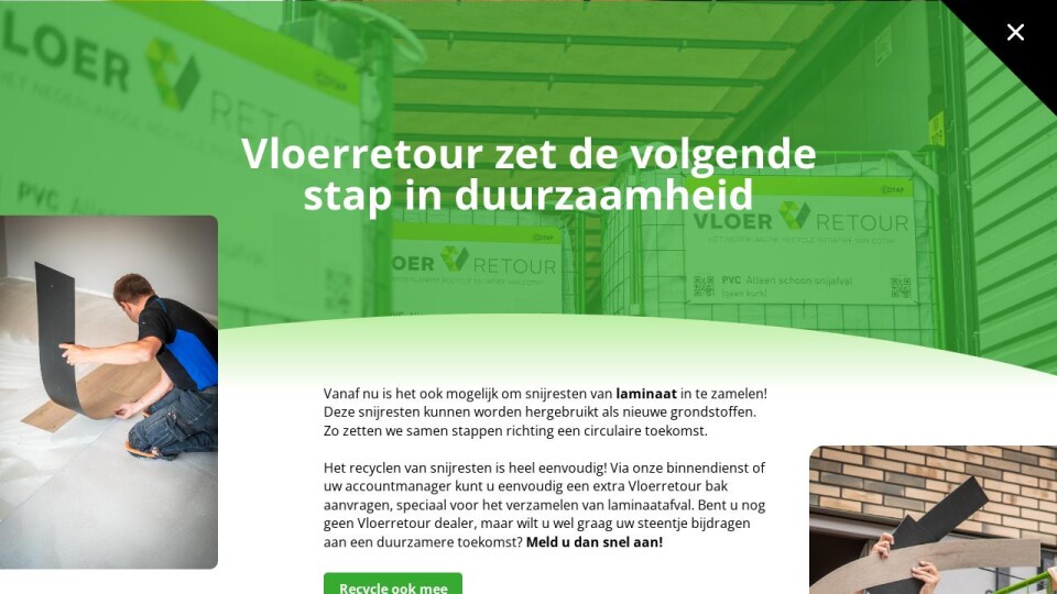 Het recyclen van snijresten is heel eenvoudig! Via onze binnendienst of uw accountmanager kunt u eenvoudig een extra Vloerretour bak aanvragen, speciaal voor het verzamelen van laminaatafval. Bent u nog geen Vloerretour dealer, maar wilt u wel graag uw steentje bijdragen aan een duurzamere toekomst? Meld u dan snel aan!