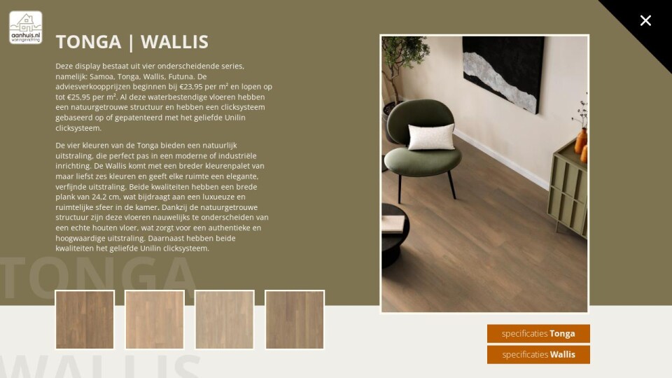 Deze display bestaat uit vier onderscheidende series, namelijk: Samoa, Tonga, Wallis, Futuna. De adviesverkoopprijzen beginnen bij €23,95 per m² en lopen op tot €25,95 per m². Al deze waterbestendige vloeren hebben een natuurgetrouwe structuur en hebben een clicksysteem gebaseerd op of gepatenteerd met het geliefde Unilin clicksysteem.