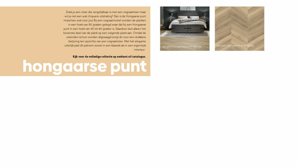 Zoek je een vloer die vergelijkbaar is met een visgraatvloer maar wil je net een wat chiquere uitstraling? Dan is de Hongaarse punt misschien wat voor jou! Bij een visgraatmotief worden de planken in een hoek van 90 graden gelegd waar dat bij een Hongaarse punt in een hoek van 45 tot 60 graden is. Daardoor sluit alleen het bovenste deel van de plank op een volgende plank aan. Omdat de uiteinden schuin worden afgezaagd zorgt dit voor een strakkere belijning ten opzichte van een visgraatvloer. Met het elegante uiterlijk past dit patroon zowel in een klassiek als in een eigentijds interieur.