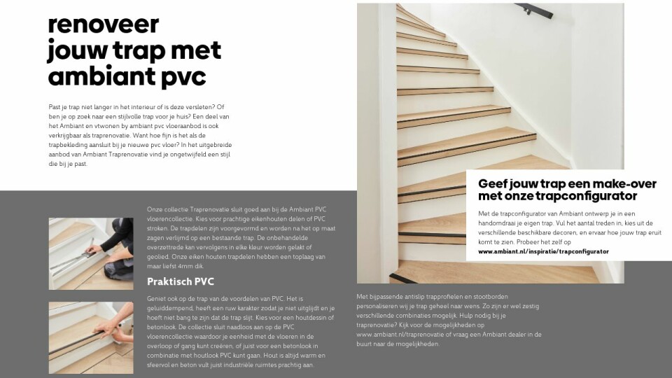 Met bijpassende antislip trapprofielen en stootborden personaliseren wij je trap geheel naar wens. Zo zijn er wel zestig verschillende combinaties mogelijk. Hulp nodig bij je traprenovatie? Kijk voor de mogelijkheden op www.ambiant.nl/traprenovatie of vraag een Ambiant dealer in de buurt naar de mogelijkheden.