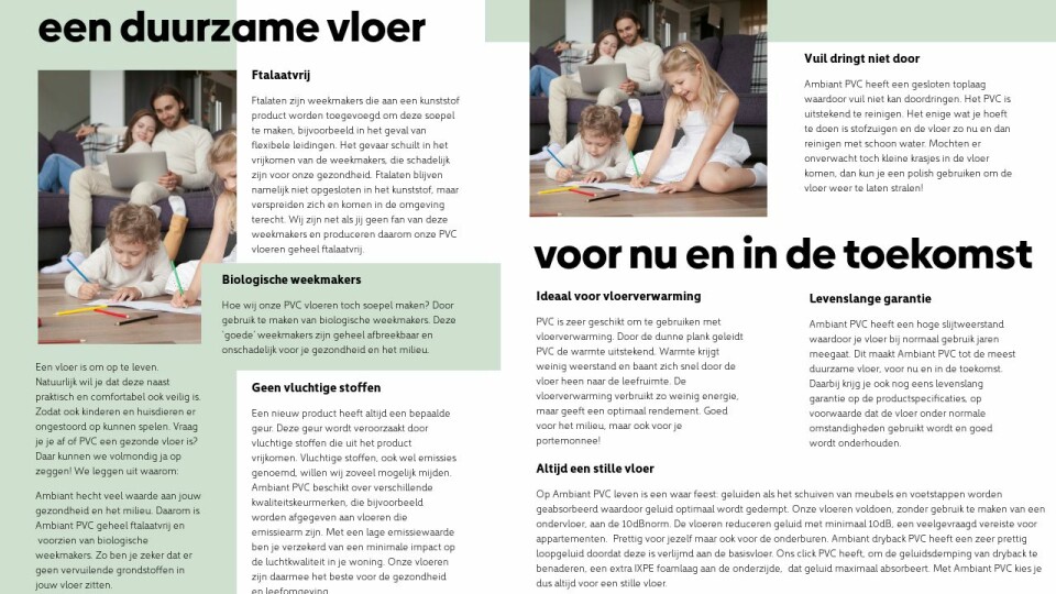 Ambiant hecht veel waarde aan jouw gezondheid en het milieu. Daarom is Ambiant PVC geheel ftalaatvrij en voorzien van biologische weekmakers. Zo ben je zeker dat er geen vervuilende grondstoffen in jouw vloer zitten.
