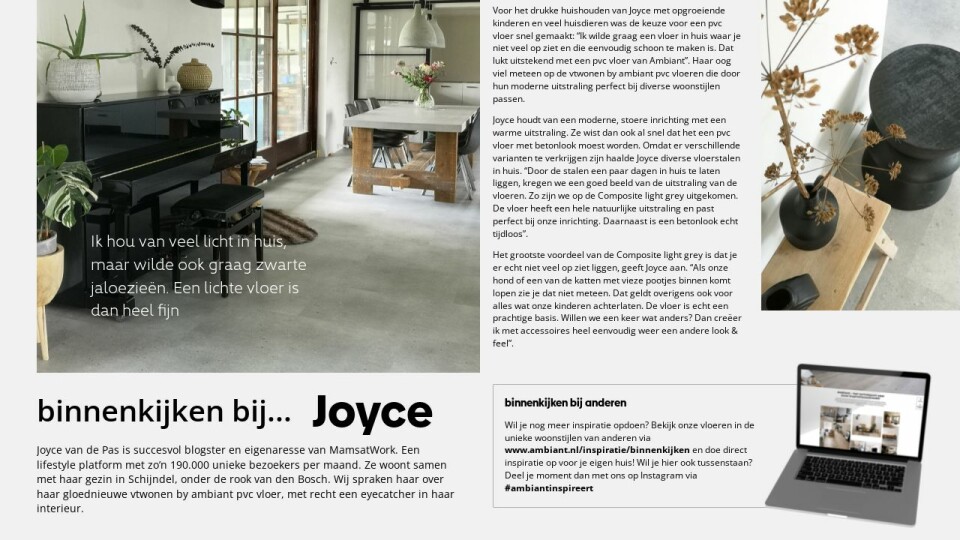 Joyce van de Pas is succesvol blogster en eigenaresse van MamsatWork. Een lifestyle platform met zo’n 190.000 unieke bezoekers per maand. Ze woont samen met haar gezin in Schijndel, onder de rook van den Bosch. Wij spraken haar over haar gloednieuwe vtwonen by ambiant pvc vloer, met recht een eyecatcher in haar interieur.