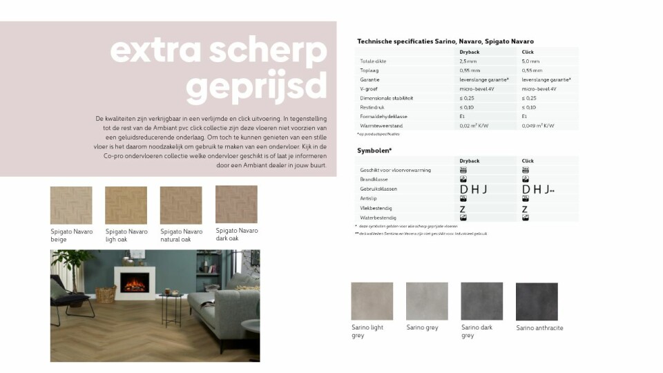 De kwaliteiten zijn verkrijgbaar in een verlijmde en click uitvoering. In tegenstelling tot de rest van de Ambiant pvc click collectie zijn deze vloeren niet voorzien van een geluidsreducerende onderlaag. Om toch te kunnen genieten van een stille vloer is het daarom noodzakelijk om gebruik te maken van een ondervloer. Kijk in de Co-pro ondervloeren collectie welke ondervloer geschikt is of laat je informeren door een Ambiant dealer in jouw buurt.