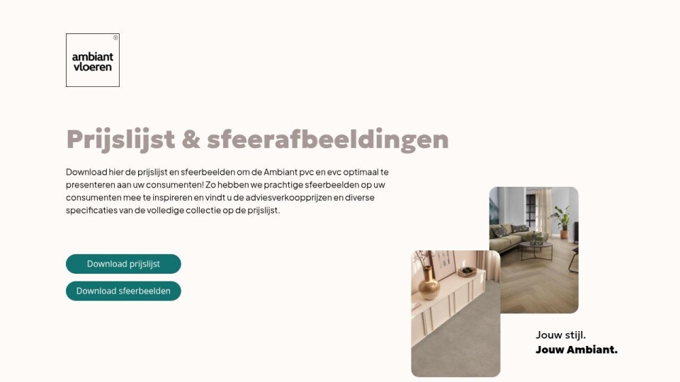 Download hier de prijslijst en sfeerbeelden om de Ambiant pvc en evc optimaal te presenteren aan uw consumenten! Zo hebben we prachtige sfeerbeelden op uw consumenten mee te inspireren en vindt u de adviesverkoopprijzen en diverse specificaties van de volledige collectie op de prijslijst.