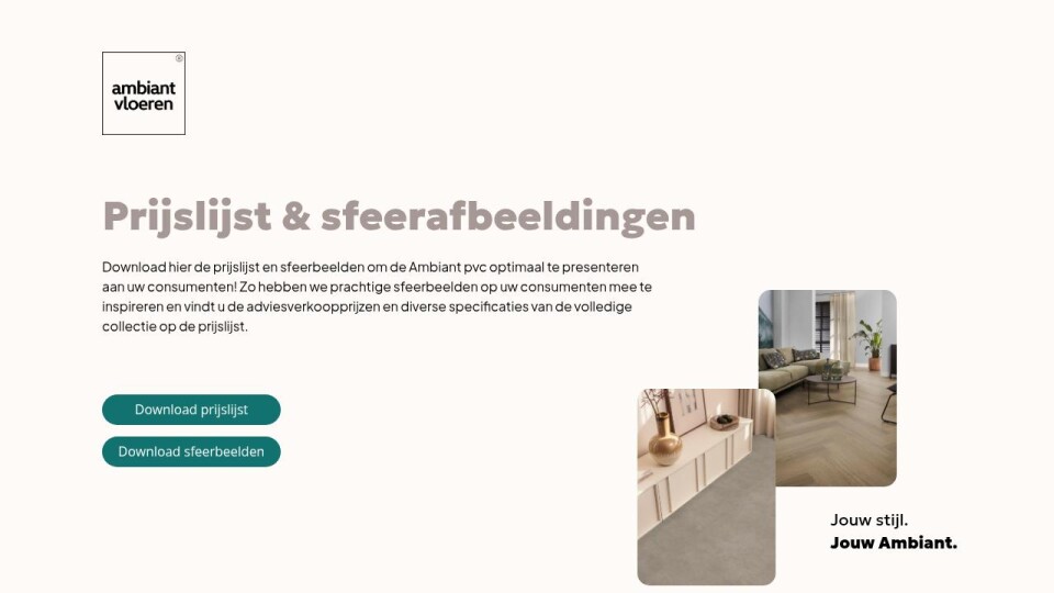 Download hier de prijslijst en sfeerbeelden om de Ambiant pvc optimaal te presenteren aan uw consumenten! Zo hebben we prachtige sfeerbeelden op uw consumenten mee te inspireren en vindt u de adviesverkoopprijzen en diverse specificaties van de volledige collectie op de prijslijst.