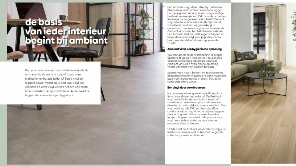 Een Ambiant vinyl vloer is trendy, betaalbaar, divers en in veel ruimtes naadloos te leggen. De toplaag van ons vinyl is van hoogwaardige kwaliteit, nauwelijks van PVC te onderscheiden. Vanwege de lange levensduur heeft Ambiant vinyl een duurzaam karakter. Als bijkomend voordeel is de vloer ook gemakkelijk in onderhoud. Bezemen, soppen of dweilen; de Ambiant vinyl vloer kan het allemaal hebben! Een topvloer met de juiste eigenschappen en bovendien vriendelijk voor je portemonnee. Geen wonder dat vinyl steeds populairder wordt!