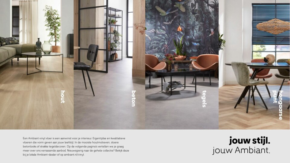 Een Ambiant vinyl vloer is een aanwinst voor je interieur. Eigentijdse en kwalitatieve vloeren die vorm geven aan jouw leefstijl. In de mooiste houtmotieven, stoere betonlooks of strakke tegeldecoren. Op de volgende pagina’s vertellen we je graag meer over ons verrassende aanbod. Nieuwsgierig naar de gehele collectie? Bekijk deze bij je lokale Ambiant-dealer of op ambiant.nl/vinyl.