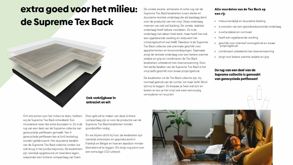 Om iets extra’s voor het milieu te doen, hebben wij de Supreme Tex Back ontwikkeld. Een innovatieve vloer die extra duurzaam is. Zo is de rug van een deel van de Supreme collectie van gerecyclede petflessen gemaakt. Van 4 gerecyclede petflessen kan al 1m2 textielrug worden gefabriceerd. Het duurzame karakter van de Supreme Tex Back collectie vinden we ook terug in het productieproces. De kwaliteiten zijn namelijk opgebouwd uit meerdere lagen, waaronder een lichtere compactlaag van foam.