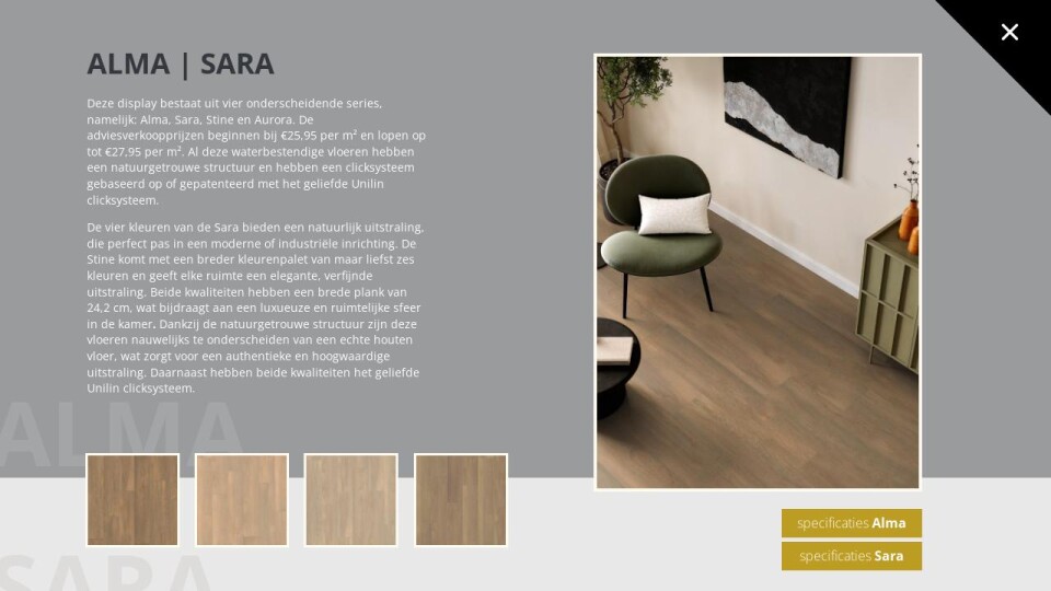 Deze display bestaat uit vier onderscheidende series, namelijk: Alma, Sara, Stine en Aurora. De adviesverkoopprijzen beginnen bij €25,95 per m² en lopen op tot €27,95 per m². Al deze waterbestendige vloeren hebben een natuurgetrouwe structuur en hebben een clicksysteem gebaseerd op of gepatenteerd met het geliefde Unilin clicksysteem.