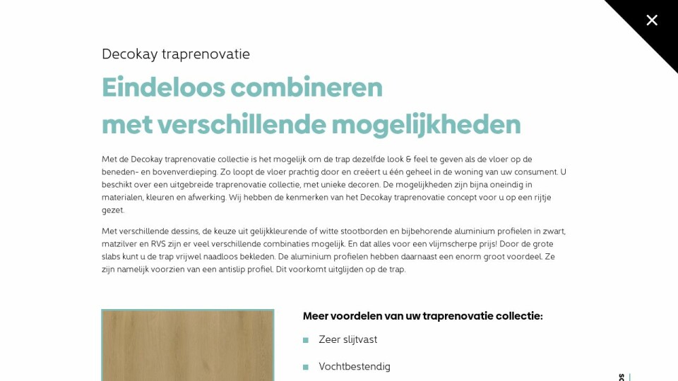 Met de Decokay traprenovatie collectie is het mogelijk om de trap dezelfde look & feel te geven als de vloer op de beneden- en bovenverdieping. Zo loopt de vloer prachtig door en creëert u één geheel in de woning van uw consument. U beschikt over een uitgebreide traprenovatie collectie, met unieke decoren. De mogelijkheden zijn bijna oneindig in materialen, kleuren en afwerking. Wij hebben de kenmerken van het Decokay traprenovatie concept voor u op een rijtje gezet.