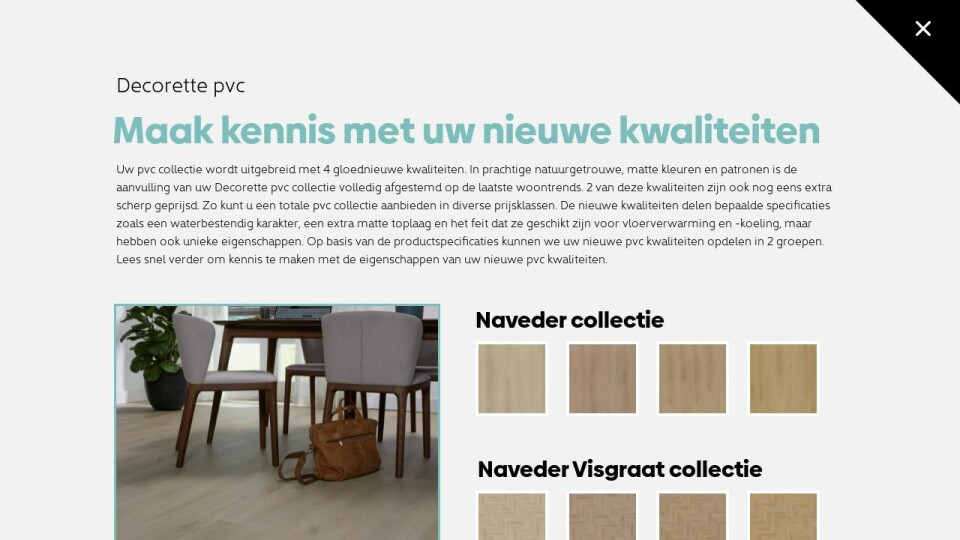 Uw pvc collectie wordt uitgebreid met 4 gloednieuwe kwaliteiten. In prachtige natuurgetrouwe, matte kleuren en patronen is de aanvulling van uw Decorette pvc collectie volledig afgestemd op de laatste woontrends. 2 van deze kwaliteiten zijn ook nog eens extra scherp geprijsd. Zo kunt u een totale pvc collectie aanbieden in diverse prijsklassen. De nieuwe kwaliteiten delen bepaalde specificaties zoals een waterbestendig karakter, een extra matte toplaag en het feit dat ze geschikt zijn voor vloerverwarming en -koeling, maar hebben ook unieke eigenschappen. Op basis van de productspecificaties kunnen we uw nieuwe pvc kwaliteiten opdelen in 2 groepen. Lees snel verder om kennis te maken met de eigenschappen van uw nieuwe pvc kwaliteiten.
