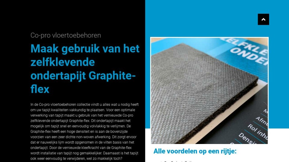 In de Co-pro vloertoebehoren collectie vindt u alles wat u nodig heeft om uw tapijt kwaliteiten vakkundig te plaatsen. Voor een optimale verwerking van tapijt maakt u gebruik van het vernieuwde Co-pro zelfklevende ondertapijt Graphite-flex. Dit ondertapijt maakt het mogelijk om tapijt snel en eenvoudig volvlakkig te verlijmen. De Graphite-flex heeft een hoge densiteit en is aan de bovenzijde voorzien van een zeer dichte non-woven afwerking. Dit zorgt ervoor dat er nauwelijks lijm wordt opgenomen in de vilten basis van het ondertapijt. Door de vernieuwde kleefkracht van de Graphite-flex wordt installatie van tapijt nog gemakkelijker. Daarnaast is het tapijt ook weer eenvoudig te verwijderen, wel zo makkelijk toch?