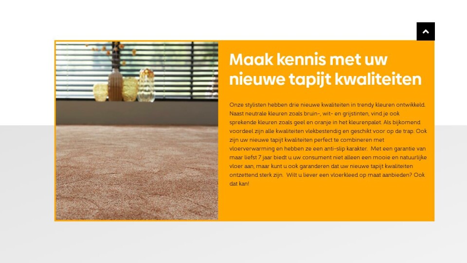 Onze stylisten hebben drie nieuwe kwaliteiten in trendy kleuren ontwikkeld. Naast neutrale kleuren zoals bruin-, wit- en grijstinten, vind je ook sprekende kleuren zoals geel en oranje in het kleurenpalet. Als bijkomend voordeel zijn alle kwaliteiten vlekbestendig en geschikt voor op de trap. Ook zijn uw nieuwe tapijt kwaliteiten perfect te combineren met vloerverwarming en hebben ze een anti-slip karakter. Met een garantie van maar liefst 7 jaar biedt u uw consument niet alleen een mooie en natuurlijke vloer aan, maar kunt u ook garanderen dat uw nieuwe tapijt kwaliteiten ontzettend sterk zijn. Wilt u liever een vloerkleed op maat aanbieden? Ook dat kan!