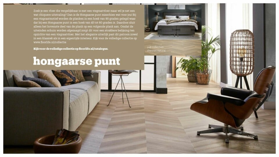Zoek je een vloer die vergelijkbaar is met een visgraatvloer maar wil je net een wat chiquere uitstraling? Dan is de Hongaarse punt misschien wat voor jou! Bij een visgraatmotief worden de planken in een hoek van 90 graden gelegd waar dat bij een Hongaarse punt in een hoek van 45 tot 60 graden is. Daardoor sluit alleen het bovenste deel van de plank op een volgende plank aan. Omdat de uiteinden schuin worden afgezaagd zorgt dit voor een strakkere belijning ten opzichte van een visgraatvloer. Met het elegante uiterlijk past dit patroon zowel in een klassiek als in een eigentijds interieur. Kijk voor de volledige collectie op www.floorlife.nl/collectie