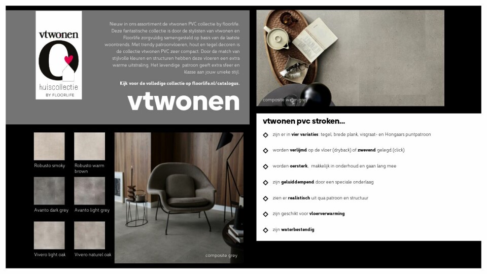 Nieuw in ons assortiment:de vtwonen PVC collectie by floorlife. Deze fantastische collectie is door de stylisten van vtwonen en Floorlife zorgvuldig samengesteld op basis van de laatste woontrends. Met trendy patroonvloeren, hout en tegel decoren is de collectie vtwonen PVC zeer compact. Door de match van stijlvolle kleuren en structuren hebben deze vloeren een extra warme uitstraling. Het levendige patroon geeft extra sfeer en klasse aan jouw unieke stijl.