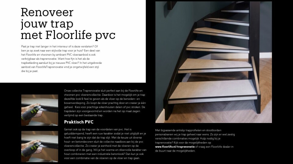 Onze collectie Traprenovatie sluit perfect aan bij de Floorlife en vtwonen pvc vloerencollectie. Daardoor is het mogelijk om je trap dezelfde look & feel te geven als de vloer op de beneden- en bovenverdieping. Zo loopt de vloer prachtig door en creëer je één geheel. Kies voor prachtige eikenhouten delen of pvc stroken. De trapdelen zijn voorgevormd en worden na het op maat zagen verlijmd op een bestaande trap.