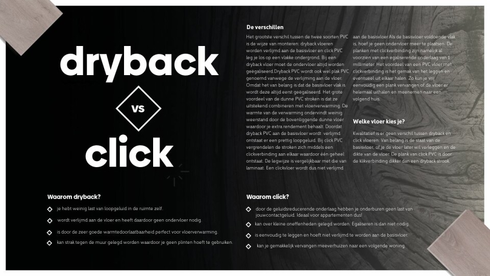 Kwalitatief is er geen verschil tussen dryback en click vloeren. Van belang is de staat van de basisvloer, of je de vloer later wil verleggen en de dikte van de vloer. De plank van click PVC is door de klikverbinding dikker dan een dryback strook. Dit is vooral van belang bij het berekenen van deuren en kozijnen.