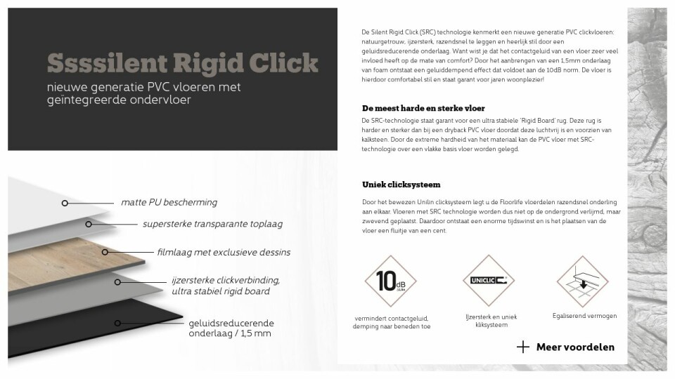 De Silent Rigid Click (SRC) technologie kenmerkt een nieuwe generatie PVC clickvloeren: natuurgetrouw, ijzersterk, razendsnel te leggen en heerlijk stil door een geluidsreducerende onderlaag. Want wist je dat het contactgeluid van een vloer zeer veel invloed heeft op de mate van comfort? Door het aanbrengen van een 1,5mm onderlaag van foam ontstaat een geluiddempend effect dat voldoet aan de 10dB norm. De vloer is hierdoor comfortabel stil en staat garant voor jaren woonplezier!