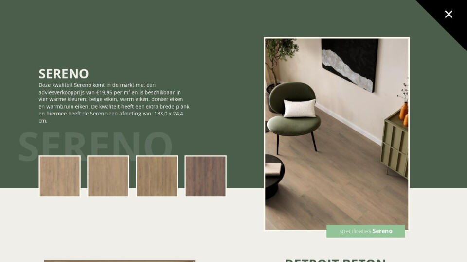 Deze kwaliteit Sereno komt in de markt met een adviesverkoopprijs van €19,95 per m² en is beschikbaar in vier warme kleuren: beige eiken, warm eiken, donker eiken en warmbruin eiken. De kwaliteit heeft een extra brede plank en hiermee heeft de Sereno een afmeting van: 138,0 x 24,4 cm.