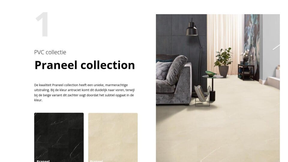 De kwaliteit Praneel collection heeft een unieke, marmerachtige uitstraling. Bij de kleur antraciet komt dit duidelijk naar voren, terwijl bij de beige variant dit zachter oogt doordat het subtiel opgaat in de kleur.