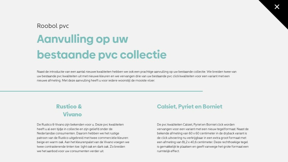 De pvc kwaliteiten Calsiet, Pyriet en Borniet click worden vervangen voor een variant met een nieuw tegelformaat. Naast de bekende afmeting van 60 x 60 centimeter in de dryback variant is de click uitvoering nu verkrijgbaar in een extra groot formaat met een afmeting van 81,2 x 40,6 centimeter. Deze rechthoekige tegel is gemakkelijk te plaatsen en geeft vanwege het grote formaat een ruimtelijk effect.