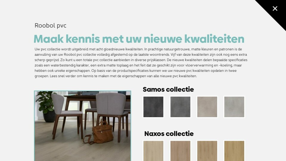 Uw pvc collectie wordt uitgebreid met acht gloednieuwe kwaliteiten. In prachtige natuurgetrouwe, matte kleuren en patronen is de aanvulling van uw Roobol pvc collectie volledig afgestemd op de laatste woontrends. Vijf van deze kwaliteiten zijn ook nog eens extra scherp geprijsd. Zo kunt u een totale pvc collectie aanbieden in diverse prijsklassen. De nieuwe kwaliteiten delen bepaalde specificaties zoals een waterbestendig karakter, een extra matte toplaag en het feit dat ze geschikt zijn voor vloerverwarming en -koeling, maar hebben ook unieke eigenschappen. Op basis van de productspecificaties kunnen we uw nieuwe pvc kwaliteiten opdelen in twee groepen. Lees snel verder om kennis te maken met de eigenschappen van alle nieuwe pvc kwaliteiten.