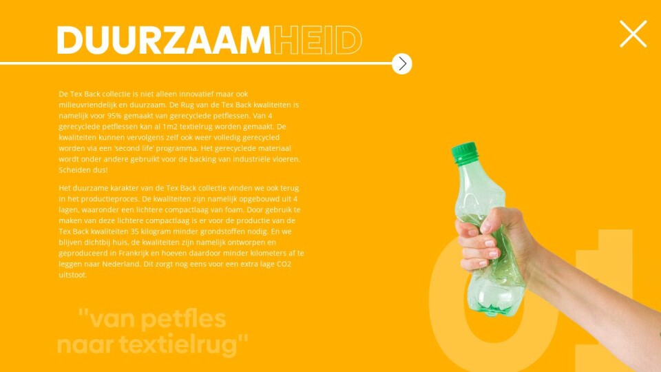 De Tex Back collectie is niet alleen innovatief maar ook milieuvriendelijk en duurzaam. De Rug van de Tex Back kwaliteiten is namelijk voor 95% gemaakt van gerecyclede petflessen. Van 4 gerecyclede petflessen kan al 1m2 textielrug worden gemaakt. De kwaliteiten kunnen vervolgens zelf ook weer volledig gerecycled worden via een ‘second life’ programma. Het gerecyclede materiaal wordt onder andere gebruikt voor de backing van industriële vloeren. Scheiden dus!