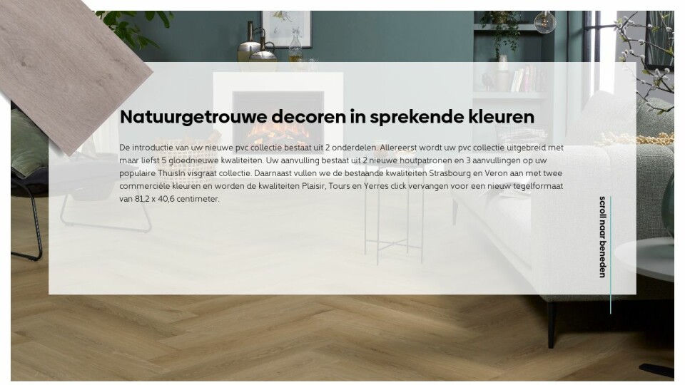 De introductie van uw nieuwe pvc collectie bestaat uit 2 onderdelen. Allereerst wordt uw pvc collectie uitgebreid met maar liefst 5 gloednieuwe kwaliteiten. Uw aanvulling bestaat uit 2 nieuwe houtpatronen en 3 aanvullingen op uw populaire ThuisIn visgraat collectie. Daarnaast vullen we de bestaande kwaliteiten Strasbourg en Veron aan met twee commerciële kleuren en worden de kwaliteiten Plaisir, Tours en Yerres click vervangen voor een nieuw tegelformaat van 81,2 x 40,6 centimeter.