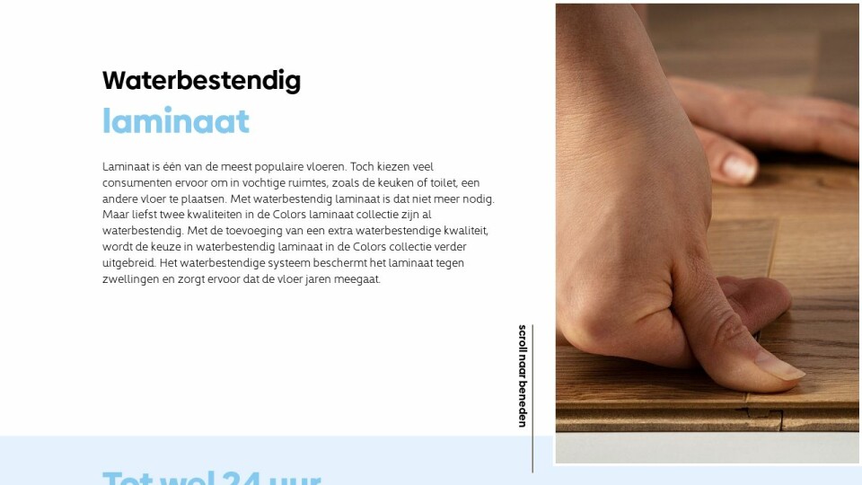 Laminaat is één van de meest populaire vloeren. Toch kiezen veel consumenten ervoor om in vochtige ruimtes, zoals de keuken of toilet, een andere vloer te plaatsen. Met waterbestendig laminaat is dat niet meer nodig. Maar liefst twee kwaliteiten in de Colors laminaat collectie zijn al waterbestendig. Met de toevoeging van een extra waterbestendige kwaliteit, wordt de keuze in waterbestendig laminaat in de Colors collectie verder uitgebreid. Het waterbestendige systeem beschermt het laminaat tegen zwellingen en zorgt ervoor dat de vloer jaren meegaat.